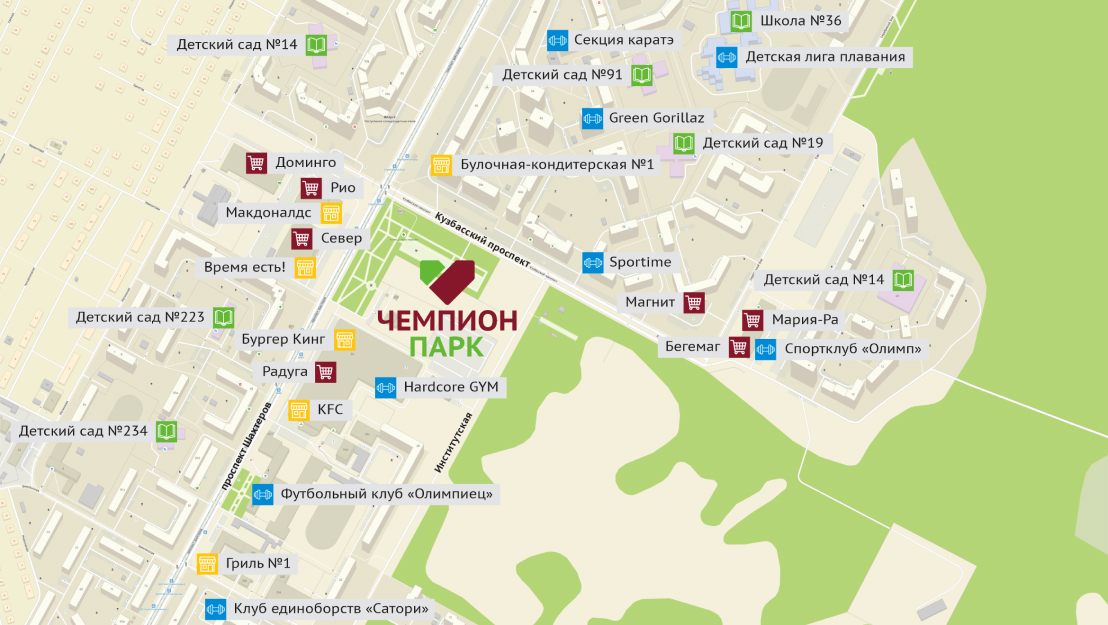«Чемпион парк» строится в новой части самого чистого района города – Рудничного. В шаговой доступности от главной улицы – проспекта Шахтеров, на новой открытой в 2021 году части Институтской улицы.