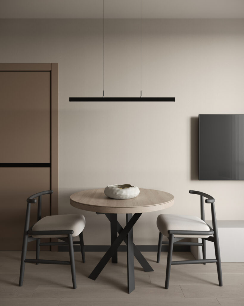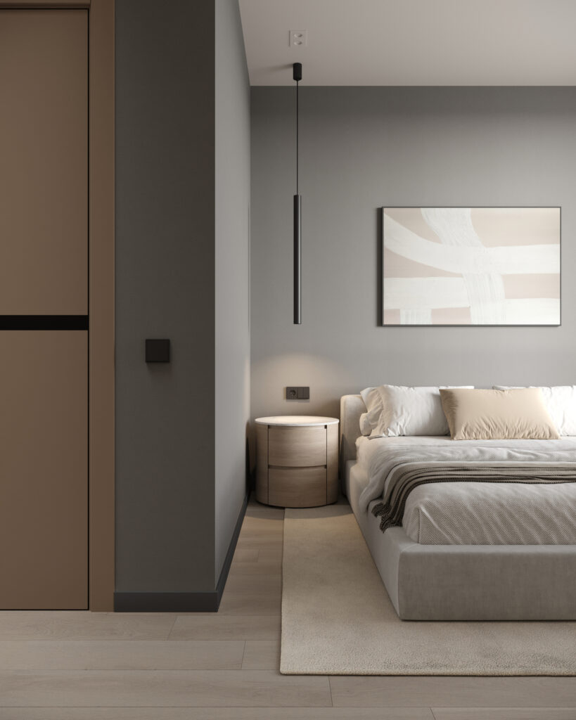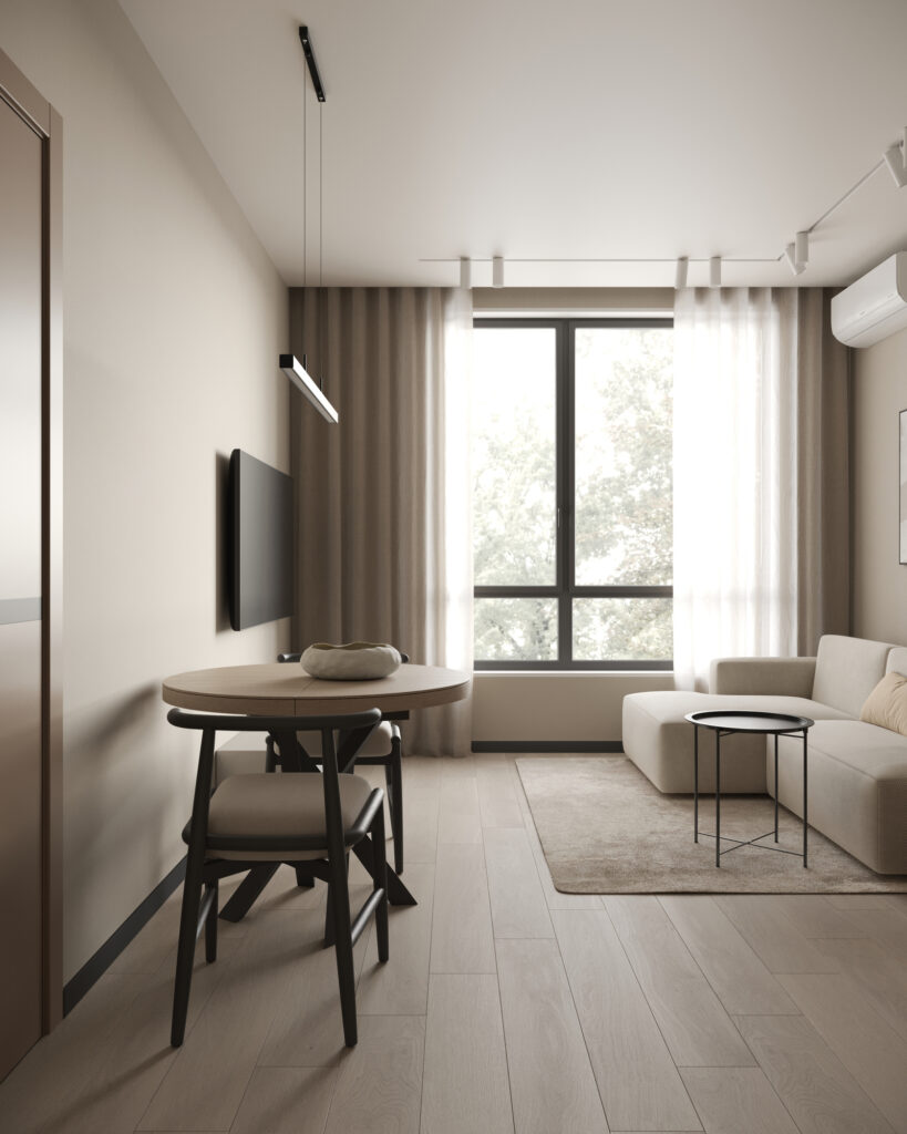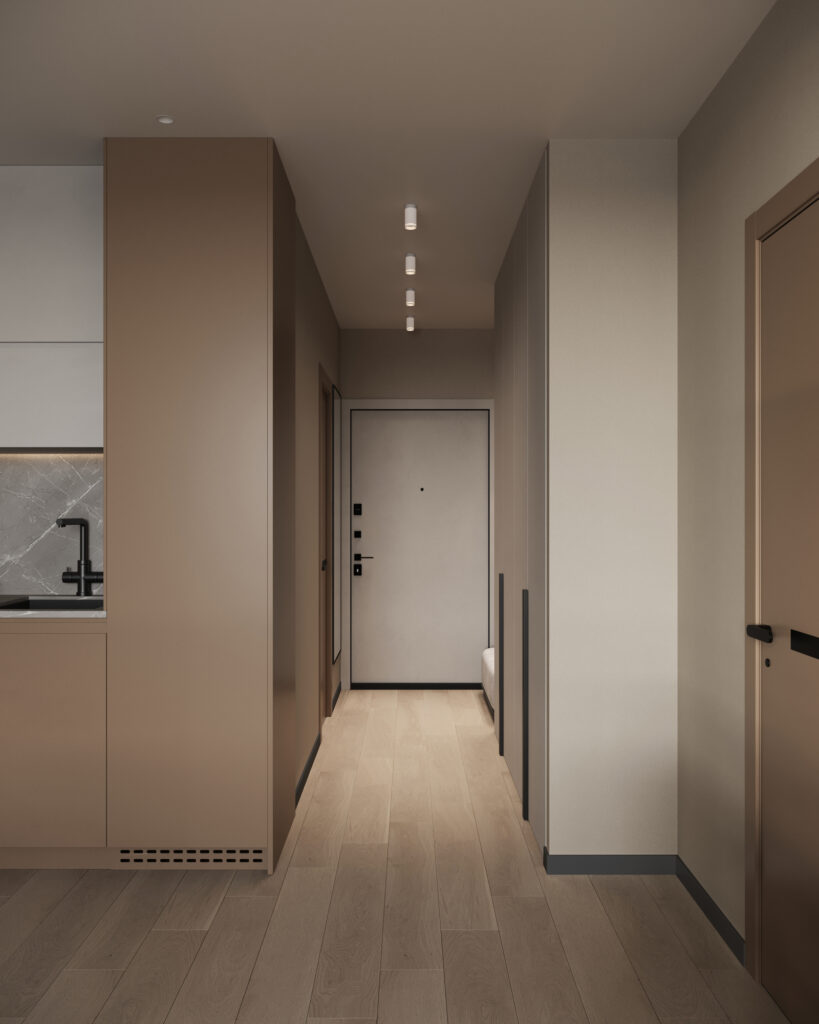 Отделка спальни, кухни-гостинной и прихожей: плитка ПВХ на полу, флизелиновые обои светлых тонов, встроенные точечные светильники, подвесы, натяжной потолок, двери Holz