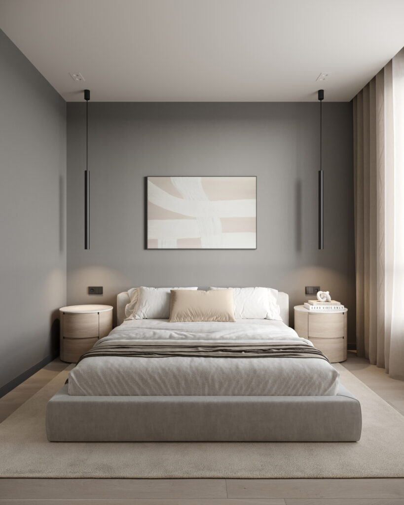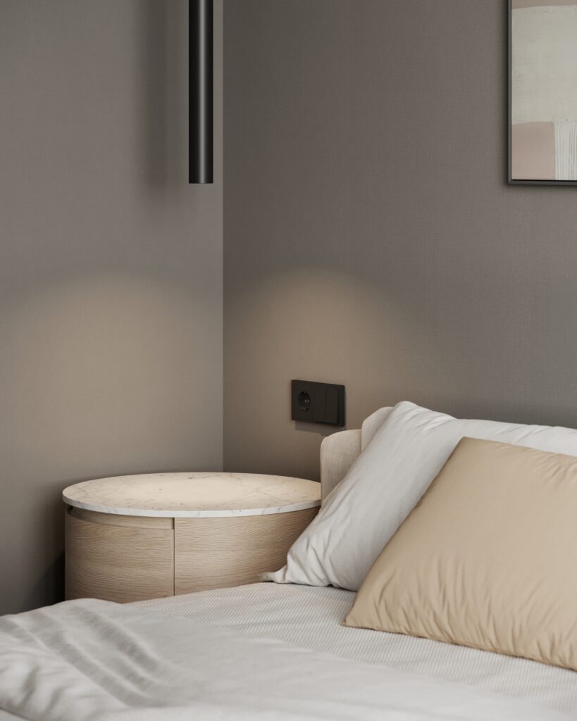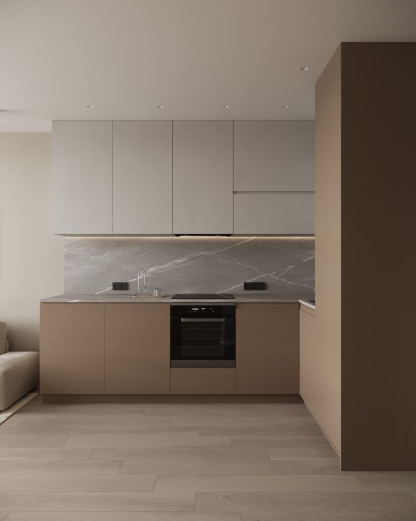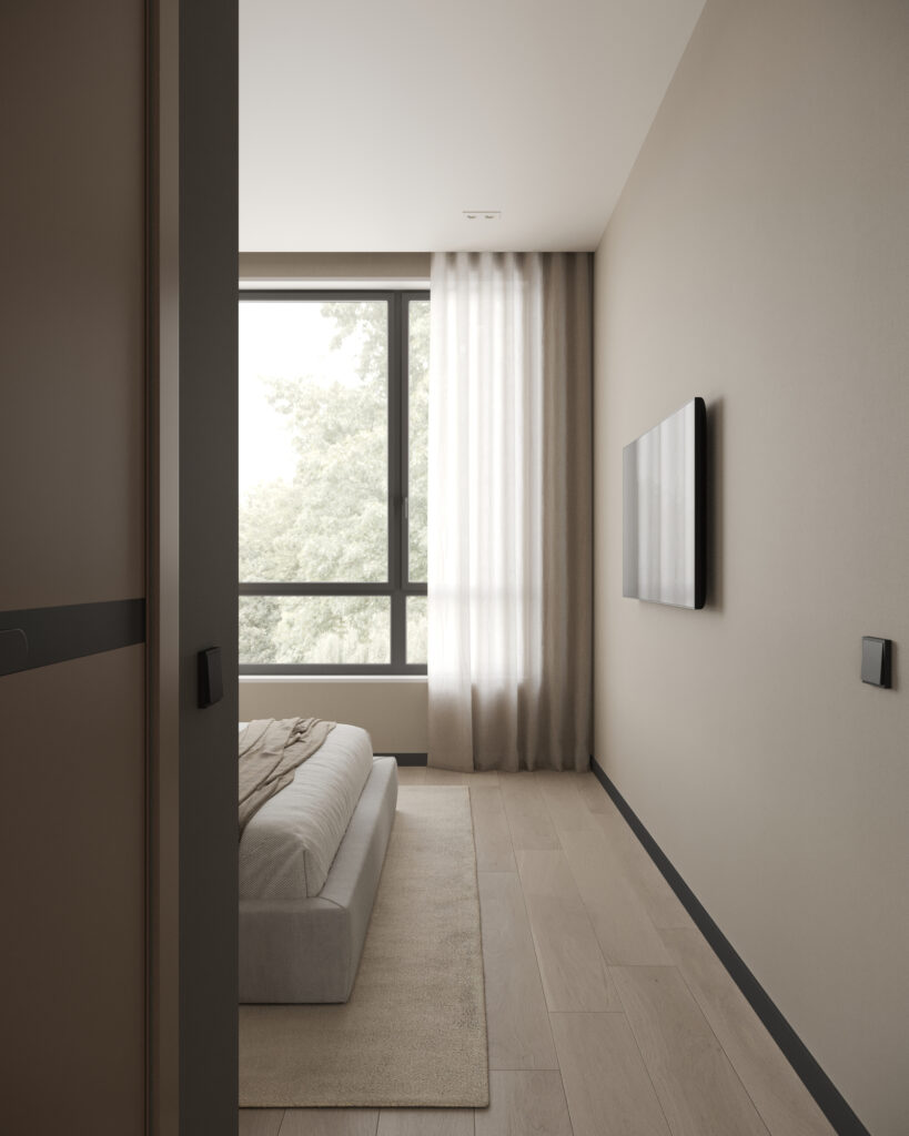 Отделка спальни, кухни-гостинной и прихожей: плитка ПВХ на полу, флизелиновые обои светлых тонов, встроенные точечные светильники, подвесы, натяжной потолок, двери Holz