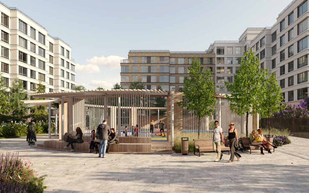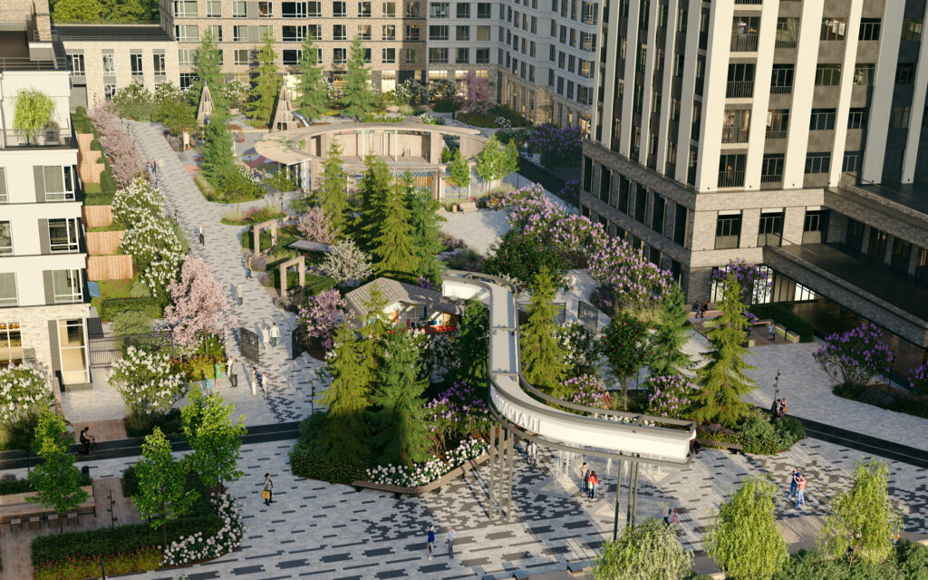 Территория комплекса объединила общественные пространства в систему бульваров для пеших прогулок, аллей, зон отдыха, детских игровых площадок и спортивных объектов, которые органично вписаны в концептуальный ландшафтный дизайн.